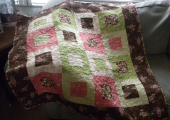 Lots of my friends are having babies - and they all need quilts! This first one is peachy pink, sage and brown - so yummy!This quilt is made from peach-pink, celery and chocolate brown. The back is a dusty flannel with flowers quilted in the ... [read more]